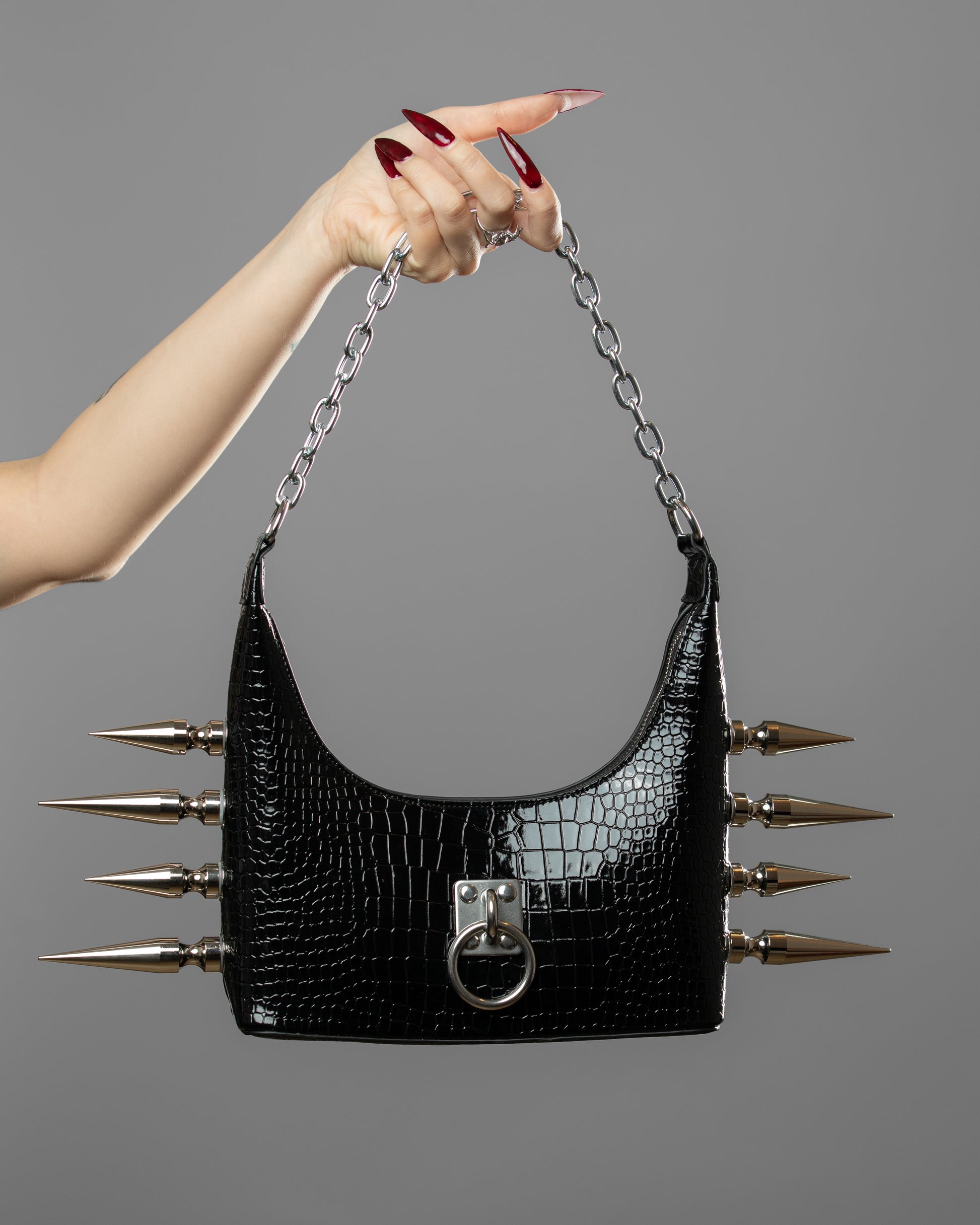 This purse is everything! The most beautiful metallic purses that are made to be seen!!!! These are embellished with large steel tree spikes, a chunky aluminum chain as a shoulder strap and Stainless steel o-rings.